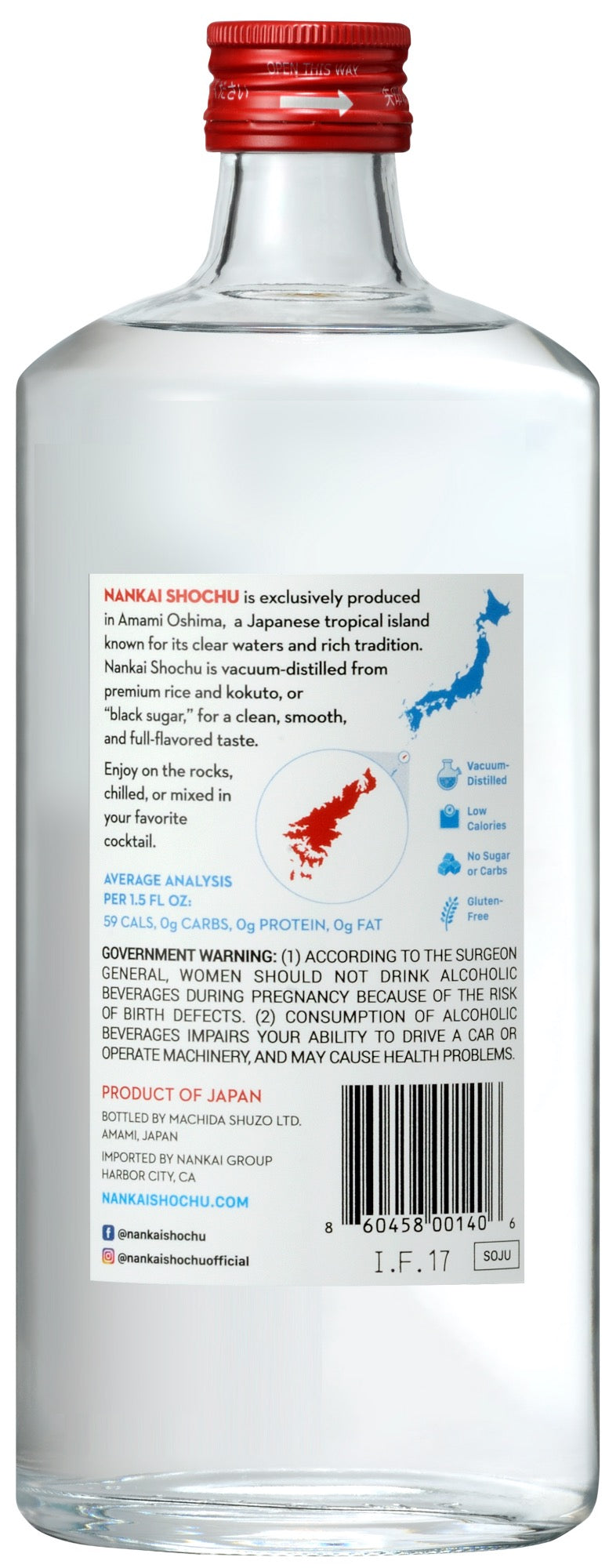 Product Description: Produced exclusively by Machida Shuzo of Amami Island, Nankai Shochu is a honkaku kokuto shochu single-distilled in a vacuum and aged 3 years in a steel tank. Featured in cocktails at many of the top bars and restaurants in CA and NY.